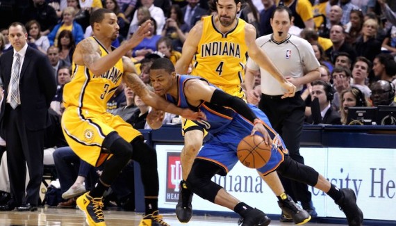Comme à son habitude, Russell Westbrook a porté son équipe sur ses épaules, en débutant par un premier quart-temps Chamberlain-esque. Roy Hibbert démarre la partie dans le bon ryhme, à 4/4 au tir, mais l’arrière-meneur d’OKC lui vole rapidement la vedette, en enquillant 18 points au bout de 9 minutes de jeu seulement. Gavé de pick&roll, adroit à 3 points, Westbrook prend aussi quelques paniers plus la faute en prime lorsque la défense se durcit. Alors que Paul George signe son entrée sur le parquet par le premier dunk de sa saison, en transition, Westbrook s’adjuge un nouveau « and-one » pour terminer le 1er quart (29-32) avec 22 unités (à 9/14 au tir).