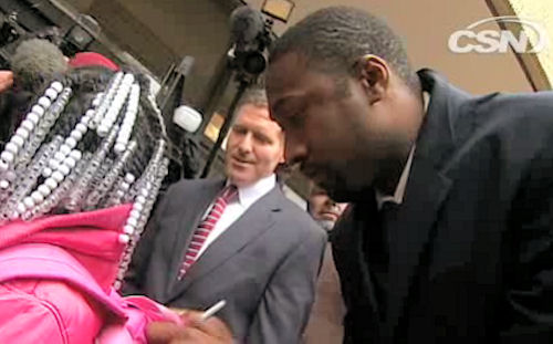 Voici son arrivée au tribunal. Comme vous pouvez le constater, il a pris le temps de dédicacer le sac à dos d’une fillette.