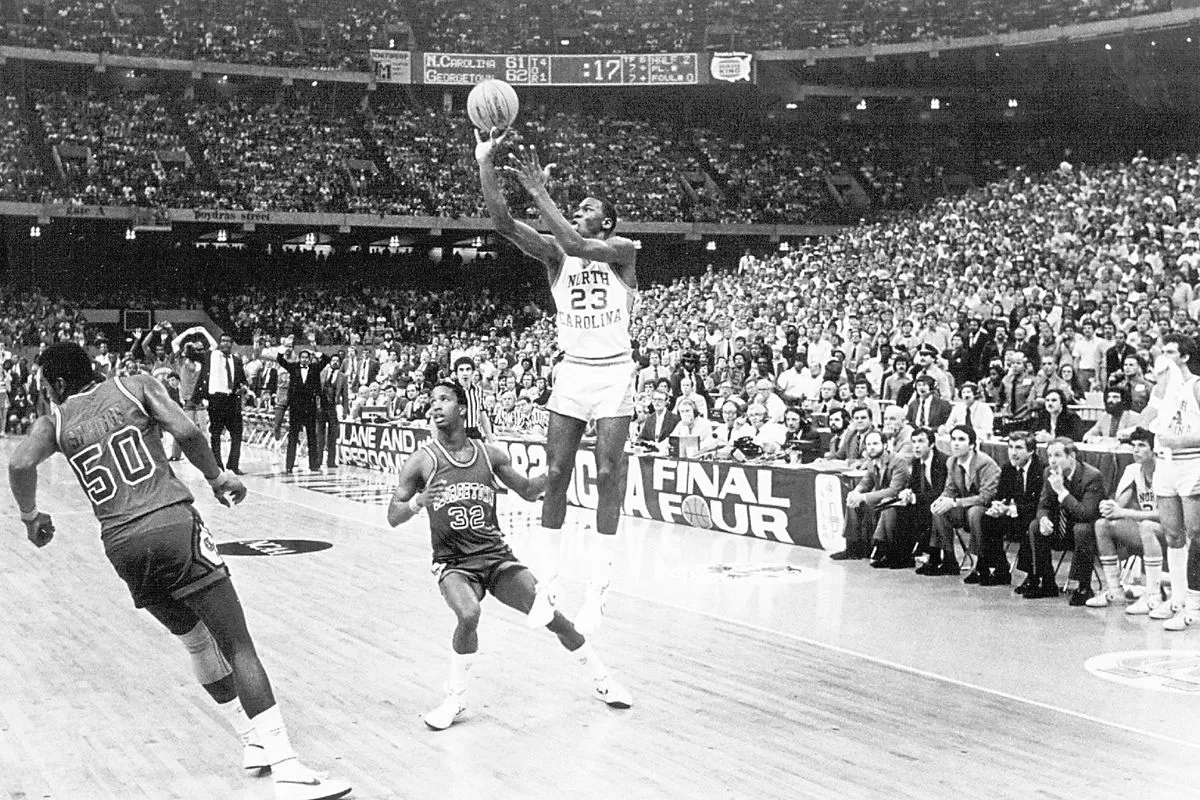 Justement déjà finaliste en 1981, North Carolina s'est renforcée avec l’arrivée d’un certain Michael Jordan, ou plutôt alors Mike Jordan, un freshman qui tourne à 13.5 points de moyenne. En face, se dresse un autre freshman, un pivot du nom Patrick Ewing. Depuis la première minute, le match est âpre et équilibré, mais spectaculaire. C'est le meilleur du basket universitaire, et ce sont les Hoyas qui basculent en tête à la pause 32-31.