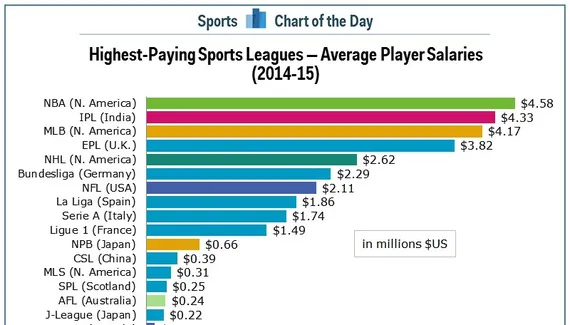 Avec 4.58 millions de dollars par joueur, la NBA devance… l’IPL, la première ligue indienne de cricket où le salaire moyen s’élève à 4.33 millions de dollars. La MLB (baseball US) complète le podium avec ses 4.17 millions annuels.
