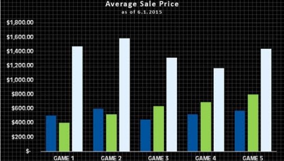 Vous l’aurez compris, la revente de places pour les matches des Finals fait flamber les prix et selon le site TicketCity, cette série entre les Warriors et les Cavs bat des records. Pour preuve, ce graphique qui compare les tarifs moyens de revente des places pour les trois dernières finales.