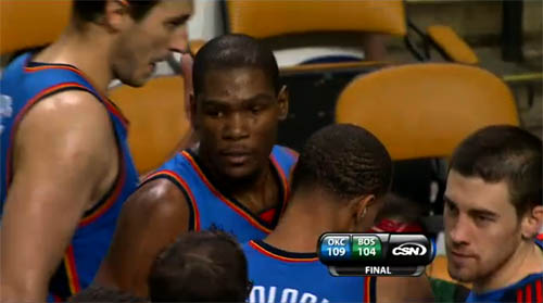 Encore une fois, les Boston Celtics ont eu bien du mal face à une jeune équipe qui aime courir et s’inclinent 109-104, emportés par les 37 points de Kevin Durant et 2 tirs primés de Jeff Green dans le money-time. Surtout, le Thunder a amené Boston dans un match d’attaque et, bien que les Celtics aient montré hier soir qu’ils avaient les armes pour se lancer dans un concours de shoots, ce n’est tout simplement pas leur jeu.