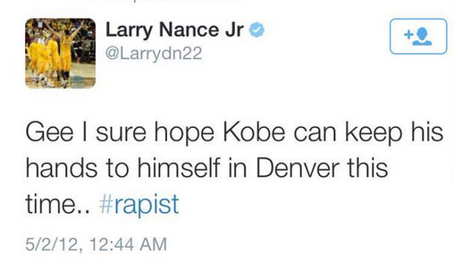 Drafté en 27e position par la franchise de la Cité des anges, Larry Nance Jr peut déjà s’attendre à une rencontre encore plus révélatrice : le rookie des Lakers a des explications à fournir à Kobe, les yeux dans les yeux. Le GM Mitch Kupchak ne dit pas autre chose quand il commente l’arrivé dans le vestiaire angeleno d’un joueur qui le 1er mai 2012 a accolé un hashtag #violeur dans un tweet acerbe : “J’espère que cette fois Kobe pourra garder ses mains dans ses poches à Denver.”