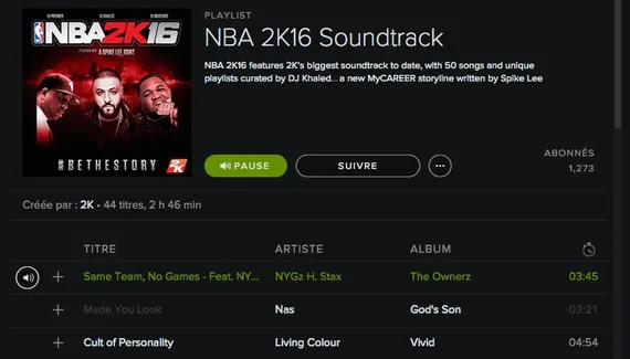 Choisis par 2K Sports pour composer la bande-son de NBA 2K16, DJ Premier, DJ Khaled et DJ Mustard ont mis en ligne sur Spotify leur playlist de 44 titres, dont quelques titres originaux, pour une durée de près de 3h00.
