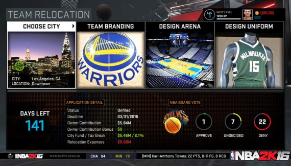 Gérer une franchise NBA, c’est aussi être un milliardaire capable de mettre la pression sur les pouvoirs publics afin de leur soutirer l’argent du contribuable pour construire une nouvelle salle, le tout en les menaçant de quitter la ville. Cette année, NBA 2K16 va vous permettre de réaliser l’étape suivante : le déménagement !