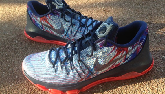 On ne prend pas de risques avec les pieds de l’ancien MVP, out une bonne partie de la saison. Comme on vient de le dire, la marque à la virgule a réussi à trouver un superbe compromis en terme d’amorti pour préserver la stabilité. Pour assurer encore plus le coup, la semelle est bien large à l’avant. Le pied est vraiment bien posé dans la base de la KD8, et cette photo de nos confrères de Nice Kicks est peut-être encore plus parlante.