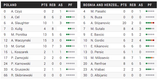 Ayant mené de 17 points en tout début de troisième quart, les Polonais se dirigeaient tout droit vers une fin de match sereine face à la Bosnie. Mais portés par un intenable Andrija Stipanovic (20 points à 8/12 aux tirs), les hommes de Dusko Ivanovic (bien agité sur le bord de touche… et même carrément sur le parquet à de nombreuses reprises) ont poussé la Pologne dans ses derniers retranchements. Avec un Marcin Gortat maladroit (4/10) mais solide (10 points, 7 rebonds), et un Adam Waczynski (15 points) incisif, les Polonais ont tenu le choc et fini par s’imposer dans la douleur (68-64). En difficulté en 2e mi-temps, Aaron Cel termine tout de même à 8 points et 7 rebonds pour ses débuts en Eurobasket.