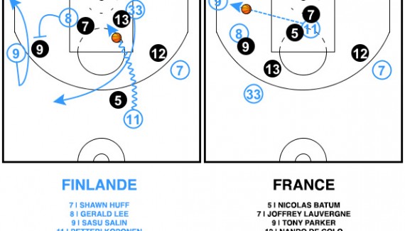 Le problème, c’est que dans le même temps, Sasu Salin a fait semblant de repartir vers la ligne médiane avant de filer vers le corner. Dans sa course, il a pu profiter d’un écran de Gerald Lee, venu bloquer Tony Parker dans son dos. Ce dernier n’a pas pu être averti par Joffrey Lauvergne, qui se concentrait sur la pénétration de Petteri Koponen dans le même temps. Surpris, le meneur des Spurs laisse donc son adversaire être servi dans un fauteuil pour égaliser.