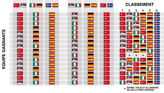 Ce qu’on voit, c’est que si la Serbie bat la Turquie cet après-midi, la France ne devrait pas rencontrer l’Espagne en huitième de finale. Pour les Bleus, les adversaires les plus probables sont donc l’Allemagne ou la Turquie.