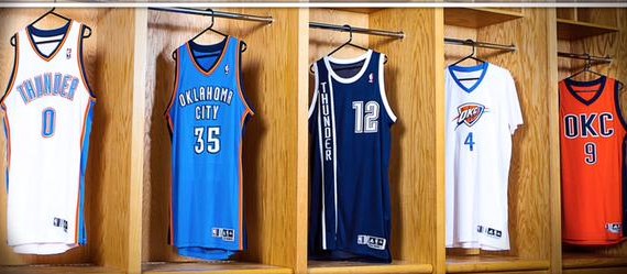 Voici les cinq maillots portés par le Thunder cette saison.