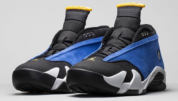 Air Jordan XIV Low “Laney”. C’est le nom de ce modèle sorti en 1999, inspiré de la voiture préférée de Michael Jordan, la Ferrari 550 Maranello (jaune, logo en écusson, forme…), et surtout dédié à la Laney High School où Son Altesse a effectué ses études.