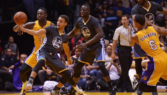 C’était une nuit sans lumière pour les Warriors : Stephen Curry limité à 22 minutes, privé de Harrison Barnes, Andrew Bogut et Klay Thompson, Golden State s’incline 85-70 dans un Valley View Casino Center de San Diego aux couleurs des Lakers. Malheureusement pour les deux équipes, les fans et la NBA, le match n’a pas été d’un grand enseignement puisqu’il s’est arrêté au cours du troisième quart-temps pour cause de terrain trop glissant.