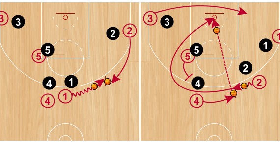 Il s’agit d’un double croisement derrière la ligne à trois points puis d’un écran dans le dos pour un alley-oop en backdoor. Nikola Mirotic récupère ainsi le ballon des mains de Jimmy Butler, qui l’avait reçu de Derrick Rose. L’arrière bouge alors puis profite du block de Pau Gasol pour aller au cercle.