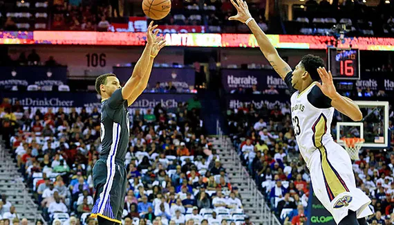 Face aux Pelicans, l'une de ses victimes préférées, la star des Warriors plante 53 points à 17/27 aux tirs, dont 8/14 à 3-points. Il ajoute 9 pds, 4 rbds et vole 4 ballons. Et comme le basket, c'est trop facile, il prend ses 3-points un bon mètre derrière la ligne… Et ce ne sont pas les grands bras d'Anthony Davis qui l'effraient.