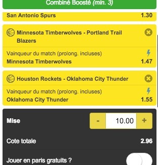 Du côté des rencontres, pas de grosses surprises à prévoir. En conséquence, on va profiter des Cotes boostées pour combiner trois cotes moyennes : les victoires des Wolves face aux Blazers, des Spurs à New York et du Thunder à Houston. Pour une mise de 10 euros, on approche les 30 euros de gains.