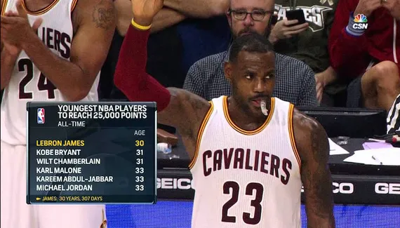 A 30 ans et 307 jours, la star des Cavs efface des tablettes Kobe Bryant qui avait franchi ce cap à 31 ans et 151 jours, et il rejoint le club très fermé des joueurs en activité ayant dépassé les 25 000 points : Tim Duncan, Dirk Nowitzki, Paul Pierce, Kevin Garnett et Kobe Bryant.
