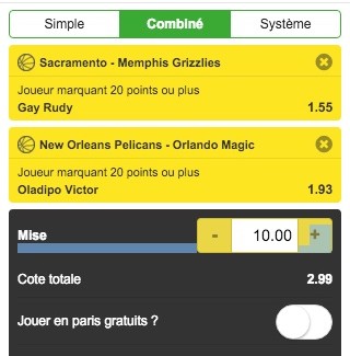 Du côté des Paris spéciaux, et des performances individuelles, on opte pour la cote de 1.55 pour les 20 pts et plus de Rudy Gay. DeMarcus Cousins n’est pas là, et Gay devrait dépasser la barre des 20 points. Autre choix : la cote de 1.93 sur Victor Oladipo. Pour une mise de 10 euros, on frôle les 30 euros de gains.
