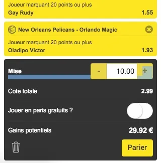 Du côté des Paris spéciaux, et des performances individuelles, on opte pour la cote de 1.55 pour les 20 pts et plus de Rudy Gay. DeMarcus Cousins n'est pas là, et Gay devrait dépasser la barre des 20 points. Autre choix : la cote de 1.93 sur Victor Oladipo. Pour une mise de 10 euros, on frôle les 30 euros de gains.