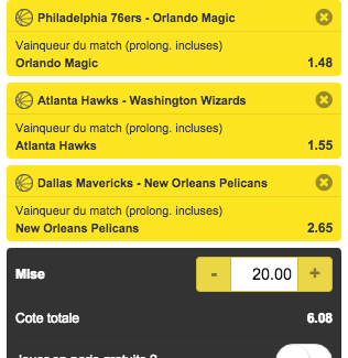 Pour les aventureux, Unibet conseille même une Cote boostée associée à une victoire du Magic à Philadelphie et d’Atlanta face à Washington. Pour 20 euros, c’est cette fois l’occasion d’empocher 121,58 euros.