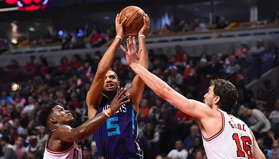 Les deux équipes ont longtemps joué les yeux dans les yeux, notamment durant la première mi-temps. Chez les visiteurs, Charlotte fait de l'effet avec un beau mouvement et un engagement défensif poussé très haut sur le terrain. Malgré la maladresse de Kemba Walker et Al Jefferson, Steve Clifford trouve des alternatives avec Nicolas Batum, puis Jeremy Lamb au cours du deuxième quart-temps. De la même manière, Fred Hoiberg compense les troubles de Derrick Rose par de bonnes pioches, avec E'Twaune Moore et Doug McDermott. Chicago fait un premier écart mais les Hornets s'accrochent et recollent à 4 pts à la pause, en dépit de Pau Gasol, très incisif (50-46).