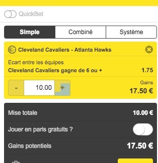 Money Time a aussi choisi de miser sur un succès des Cavs face aux Hawks dans le choc de la conférence Est. La cote est de 1.75 pour une victoire de 6 points et plus.