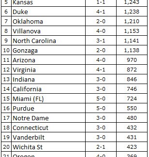 Les Spartans sont suivis par Iowa State, Kansas, Duke, Oklahoma, Villanova, North Carolina, qui recule donc au 9e rang, et Gonzaga. Le panel n’a donc pas tenu rigueur des défaites concédées par Kansas et Duke lors du Champions Classic (face à Michigan State et Kentucky), qui ne perdent qu’une seule place cette semaine.