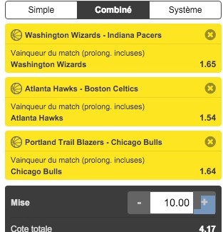 Même si Kobe Bryant a vu des choses bien plus étranges, on ne misera pas sur les Lakers à 10 contre 1… En revanche, la grosse cote, c’est de miser sur un combiné des victoires des Wizards, des Hawks et des Bulls. Ce qui donne une cote de 4.17 sur Unibet. Pour une mise de 10 euros, c’est la possibilité de gagner 41,70 euros. A réfléchir…