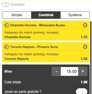 Comme le combiné San Antonio-Utah a parfaitement fonctionné la nuit dernière, Money Time propose de miser sur un autre combiné avec les victoires de Toronto face à Phoenix et de Charlotte contre Milwaukee. Ce qui donne une cote de 1.89 chez Unibet, et on placera 15 euros pour une possibilité de gains supérieure à 28 euros.