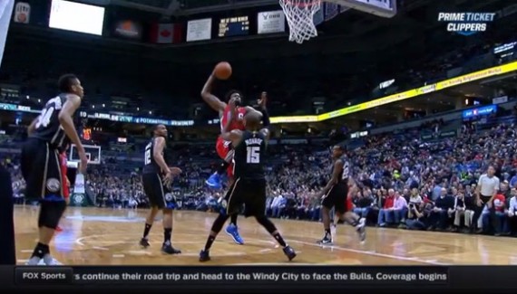 Les grincheux diront que ce n’est pas un dunk car DeAndre Jordan jette la balle dans le cercle sans toucher l’arceau… Mais il n’en demeure pas moins que ce poster “à la Blake Griffin” sur la tête de Greg Monroe se pose direct comme un candidat sérieux au titre de dunk de l’année.