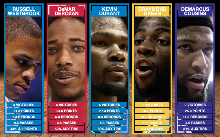À l'aile, Kevin Durant est une évidence malgré les performances de LeBron James ou Nicolas Batum, qui signe un triple double face à Miami. À l'intérieur, DeMarcus Cousins s'est réveillé. À ses côtés, on a encore beaucoup hésité entre Blake Griffin et Draymond Green. Et même s'il a été maladroit de loin cette semaine, on choisit cette fois l'ailier fort des Warriors, auteur d'un match titanesque face à Boston (24 points, 11 rebonds, 8 passes, 5 interceptions et 5 contres).