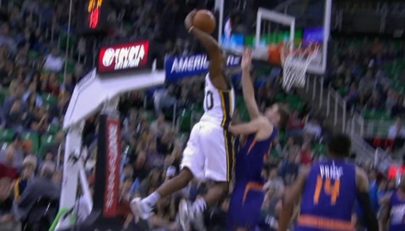 Pour Rudy Gobert, il ne fait aucun doute qu’Alec Burks doit être numéro 1 du Top 10. On peut même ajouter que son coéquipier se positionne très haut au classement des plus beaux dunks de l’année. A la Blake Griffin, il est contraint de jeter le ballon dans le cercle, mais quelle détente ! La réaction du banc de Jazz est épique.