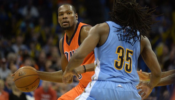Défaits la veille à San Antonio, les Nuggets rentrent rapidement dans leur match, à l’image d’un Kenneth Faried saignant. L’international américain postérise sans tarder un Serge Ibaka endormi et Denver prend les commandes du match. Le “Manimal” inscrit ainsi 10 points en 6 minutes (à 5/7 aux tirs). À ses côtés, Joffrey Lauvergne est également en jambes. Kevin Durant commence fort avec des paniers compliqués mais le bas blesse à l’opposé du terrain pour les locaux.