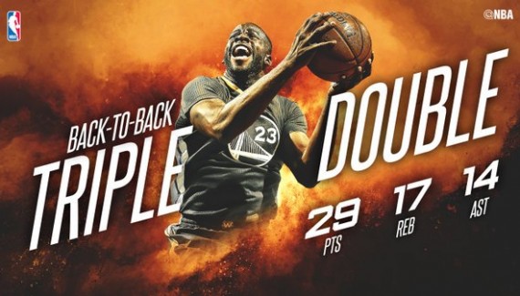Draymond Green confirme son nouveau statut de roi du “triple double” avec un deuxième d’affilée, réalisé face aux Nuggets. Auteur d’un premier quart-temps exceptionnel (18 pts, 4 rbds et 4 pds), l’ailier-fort des Warriors a tenu la baraque jusqu’au bout pour réussir son 6e triple double de la saison avec 29 pts, 17 rbds et 14 pds à 10/16 aux tirs dont un 5/9 à 3-points. Le tout pour une évaluation de 54 ! Il faut remonter à Larry Bird en 1987 pour trouver trace d’un tel triple double, et il est même le premier Warrior à enchaîner deux triple double de suite sur deux saisons.