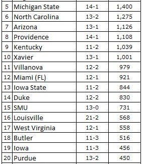 Ont aussi reçu des votes : Gonzaga 61, California 54, Texas Tech 40, George Washington 38, Saint Mary’s 23, Baylor 22, Oregon State 4, Colorado 4, Seton Hall 4, Saint Joseph’s 3, Wichita St 3, Utah 3, Cincinnati 2, Indiana 2, Michigan 2, Akron 1, Oregon 1.