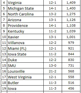 Ont aussi reçu des votes : Gonzaga 61, California 54, Texas Tech 40, George Washington 38, Saint Mary's 23, Baylor 22, Oregon State 4, Colorado 4, Seton Hall 4, Saint Joseph's 3, Wichita St 3, Utah 3, Cincinnati 2, Indiana 2, Michigan 2, Akron 1, Oregon 1.