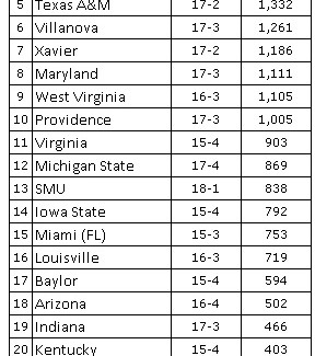 Iowa gagne six places et monte sur le podium pour la première fois depuis janvier 1987. Les Hawkeyes ont déjà battu cinq équipes du Top 25 cette saison, dont deux victoires face à Michigan State. La Big 12 continue sa démonstration de force puisque Kansas se classe 4e et Texas A&M est 5e, le meilleur classement de son histoire. Suivent deux équipes de la Big East, Villanova et Xavier. Maryland recule d’une place et occupe la 8e place cette semaine devant West Virginia, encore un membre de la Big 12, et Providence, le 3e membre de la Big East.