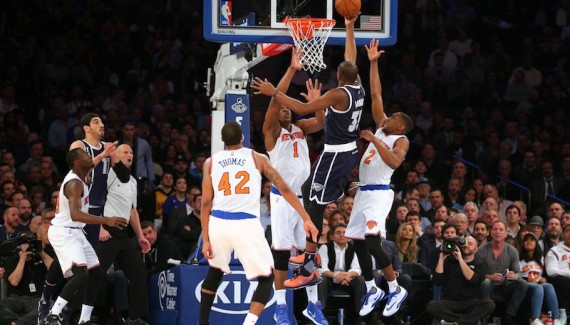 Au retour des vestiaires, le mano a mano se poursuit et les deux équipes restent au contact l’une de l’autre pendant tout le troisième quart-temps. Westbrook est au four et au moulin et sert parfaitement Durant, très agressif en attaque. Le MVP 2014 provoque la défense des Knicks et une avalanche de fautes, mais encore une fois, ce sont les New-yorkais qui gardent le contrôle au tableau d’affichage, 91-88 après 36 minutes de jeu.