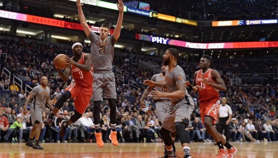 Malgré un James Harden à côté de son basket, les Rockets sortent vainqueurs (111-105) de leur 200e opposition face aux Suns. Dwight Howard malmené par le tandem Chandler-Len, ce sont Trevor Ariza et Corey Brewer qui font la différence avec 22 et 24 points chacun.