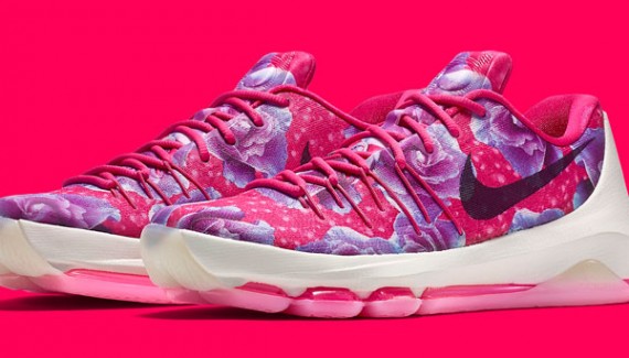 Après un coloris très sobre sur la KD7, les roses sont de retour en grand format sur la tige de la KD8. Au passage, le joueur du Thunder en profite pour afficher son soutien à la lutte contre le cancer du sein. D’abord avec la couleur rose, mais aussi avec la présence du ruban rose du Kay Yow Cancer Fund sur le talon.