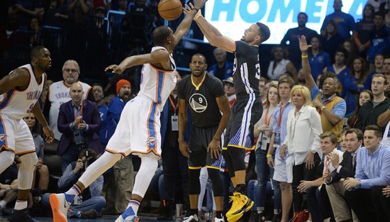 Kevin Durant venait d’inscrire un tir à trois points pour atteindre les 37 unites. Il restait 14.5 secondes à jouer et le Thunder menait de quatre points (103-99) face aux Warriors. La victoire tendait les bras au MVP 2014 et à ses camarades.