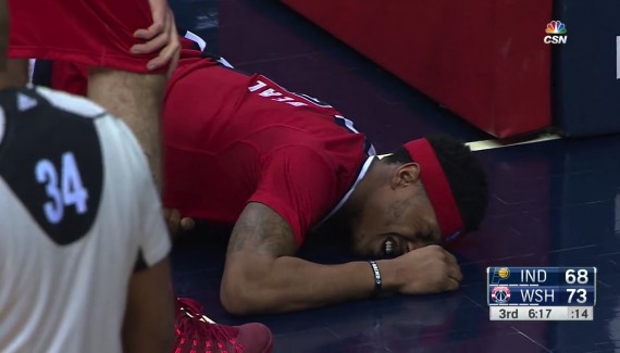 En troisième quart, après avoir scoré 12 points, Bradley Beal a effectivement chuté lourdement sur une faute d’Ian Mahinmi. Déséquilibré par la suite par de Myles Turner, il a fini les quatre fers en l’air, avec un vilain coup sur la hanche.