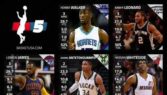 Comme l’an passé, Basket USA vous propose chaque lundi son cinq majeur de la semaine puisque la NBA décerne simplement deux trophées de « Player Of The Week », pour chaque conférence. Au poste de meneur, on retrouve Kemba Walker, impérial avec ses Hornets. À la différence de Stephen Curry, Chris Paul ou Kyle Lowry, le maître à jouer de Charlotte n'a pas perdu de la semaine, et sa formation a bien digéré la (nouvelle) perte de Michael Kidd-Gilchrist.