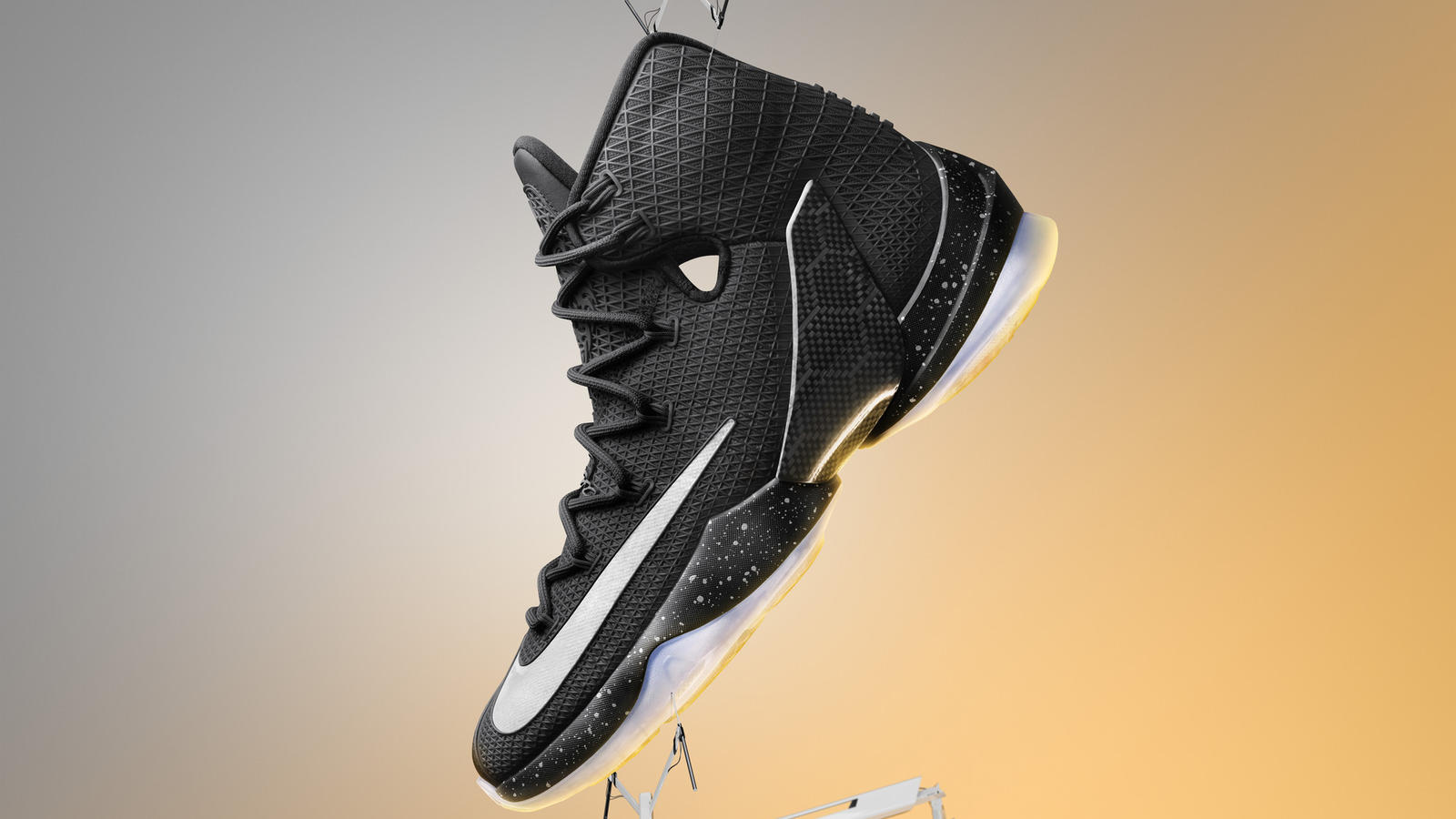 La grosse nouveauté, c’est l’utilisation du “Kurim.” Cette matière qui ressemble à du caoutchouc recouvre toute la tige. Des couches plus fines sont placées sur les zones ou la chaussure doit être plus souple, tandis que des épaisseurs supplémentaires sont posées sur les endroits importants en terme de maintien. Le bout des orteils, lui, est recouvert de cuir, tandis que la plaque en fibre de carbone est légèrement plus imposante que sur la LeBron 13 classique.