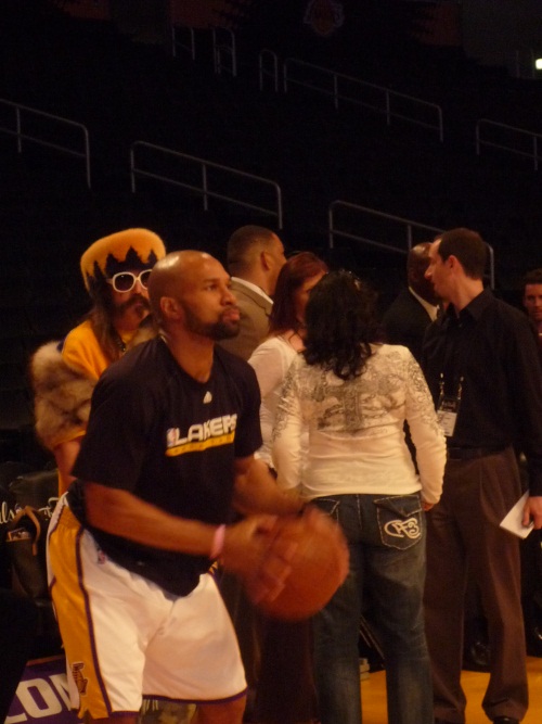 Trois heures avant le match, les équipes ont fini les entraînements collectifs. Place aux ateliers individuels de certains joueurs, comme ici Derek Fisher à 3-pts. Quelques instants après lui, Sasha Vujacic se montrera bien plus adroit. On aurait dit Ray Allen pendant le match. Mais on n’était qu’à l’entraînement.