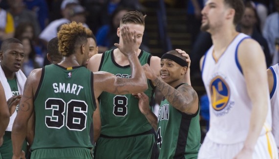 Pour la 15e fois d’affilée, Isaiah Thomas termine meilleur marqueur des Celtics, confirmant qu’il est bien devenu le leader et le patron de la franchise. Pourtant, à la mi-temps du match face aux Warriors, il n’en menait pas large avec son zéro pointé à 0/7 aux tirs… mais il avait réservé le meilleur pour la deuxième mi-temps, nous gratifiant d’un duel de folie avec Stephen Curry dans le 3e quart-temps.
