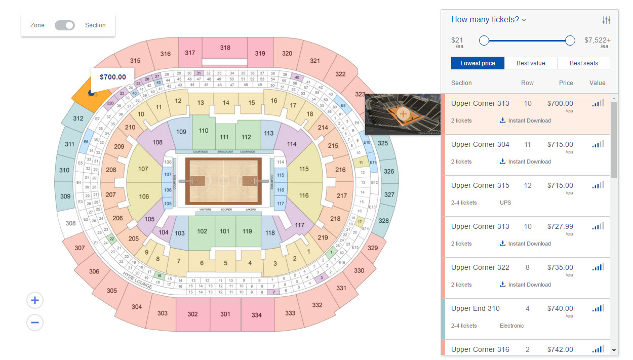 Aujourd’hui, le prix minimum pour avoir une place est de 700 dollars sous le plafond du Staples Center et de 380 dollars pour une place debout à l’Oracle Arena. Un fan a d’ailleurs acheté deux places au bord du terrain pour le match des Lakers pour 27 500 dollars… par place. Mais quand on aime, on ne compte pas !
