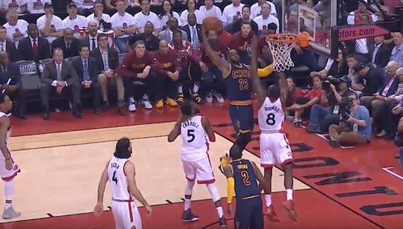 Mais il n'est que deuxième car LeBron James réussit un superbe lay up pour éviter le contre du même Biyombo. Une leçon de hang time.