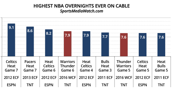 C'est 39% de plus que pour le Game 6 entre les Spurs et le Thunder, en 2014 (il n'y avait pas eu de Game 6 en finale de conférence l'an passé). À l'Ouest, il n'y avait d'ailleurs plus eu autant de personnes devant le sixième match d'une finale de conférence depuis 2002. Et la rencontre entre les Kings et les Lakers (regardée par 13.5% des foyers américains) était diffusée sur le réseau national alors que TNT est une chaîne du câble…