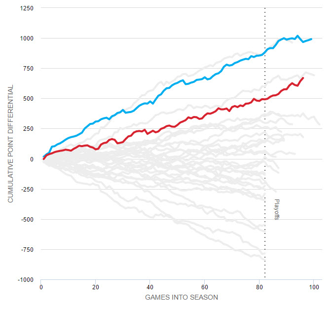 10.77 : l’écart moyen par match des Warriors en saison régulière, cinquième meilleur chiffre de l’histoire.