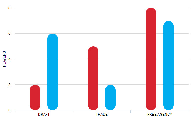 6 : le nombre de joueurs acquis via la Draft par les Warriors, dont Stephen Curry, Klay Thompson et Draymond Green, contre seulement 2 pour les Cavs (Kyrie Irving et Tristan Thompson). LeBron James, de retour de Miami, est inclus dans la “free agency”.